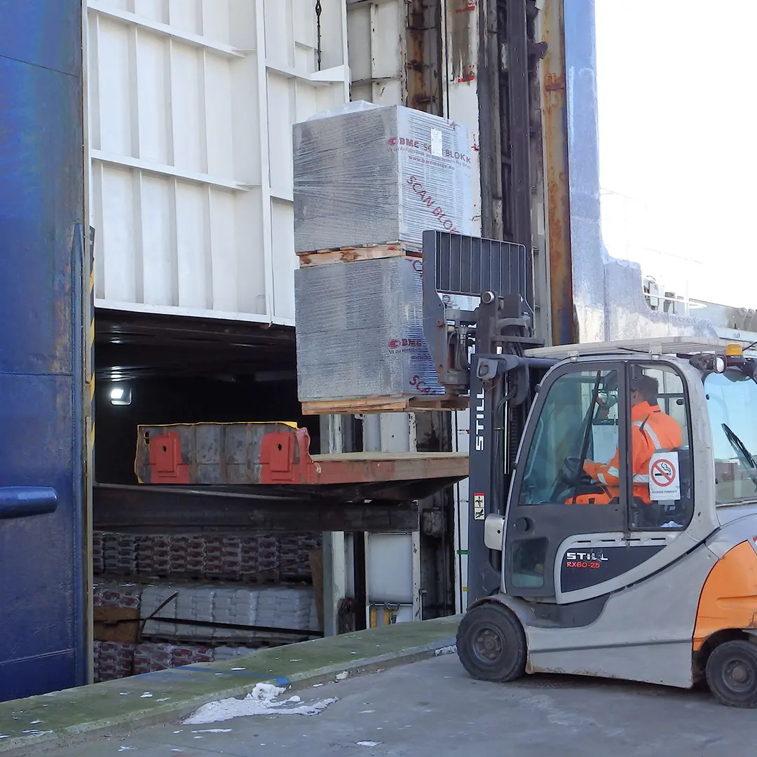 For vores kunde BMC A/S står vi for levering af diverse byggematerialer til Norge. Materialerne afhentes med lastbil rundt omkring i Danmark og køres til Thyborøn, hvor de registreres og stilles på lager.